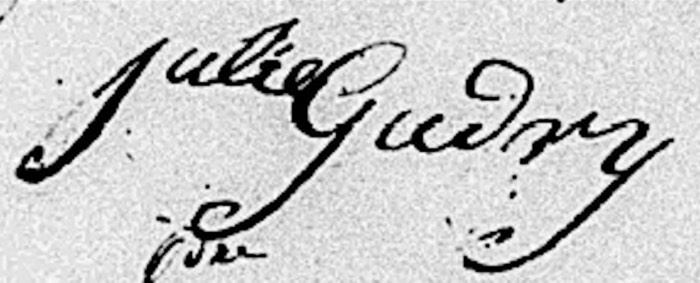 Julie Guedry (daughter of Pierre Guedry & Marguerite Miller) [from Oliver Guedry fils & Elizabeth Belsire Thibaudeau Marriage (v. 6 #290-[sic - v. 10 #290]; St. Martin de Tours Catholic Church; St. Martinville; St. Martin Parish, LA)